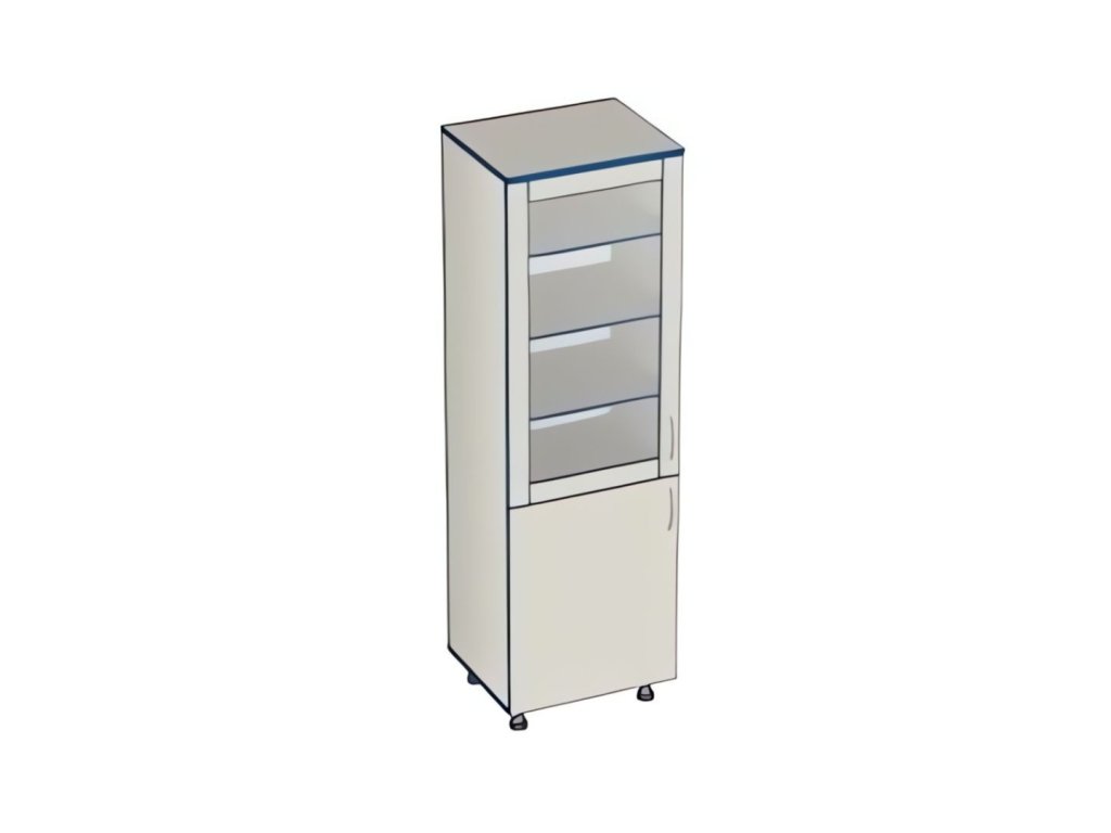 Skriňa laboratórna dvojdverová presklenná z 18 mm laminovanej drevotriesky s 2 mm ABS páskou. Použitý materiál spĺňa technické normy podľa STN EN.